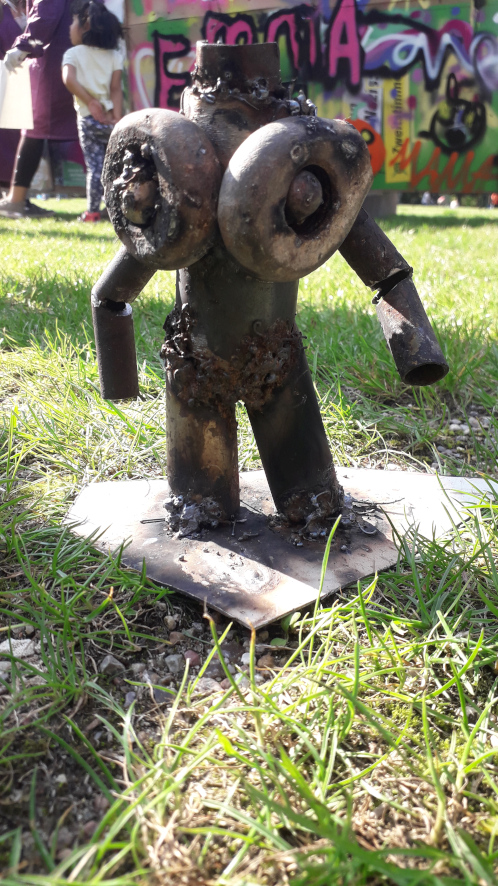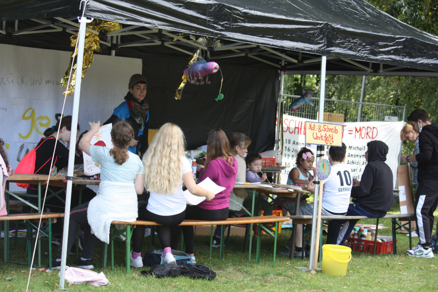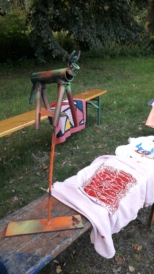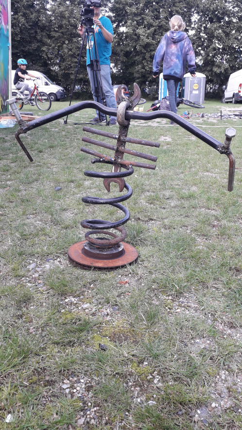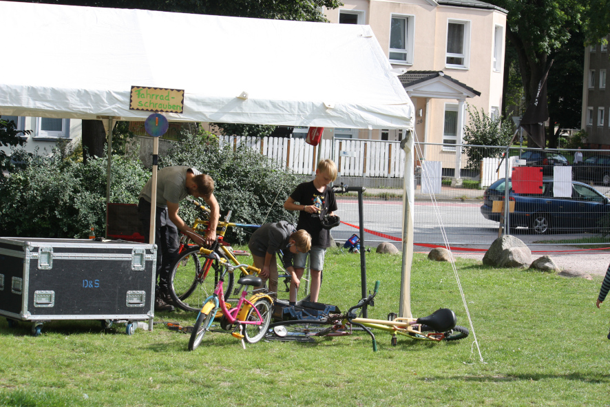 An einer Graffitiwand wurde gesprayed; in der Musikwerkstatt wurde am Schlagzeug und anderen Instrumenten gejammt; im 12m langen Kunstschweißpavillon waren teilweise 4 Schweißgeräte gleichzeitig in Betrieb, an denen junge Menschen ab 10 Jahren Schrott in Kunst verwandelten; nebenan lernten Kinder, wie sie ihre Fahrräder selbst reparieren können; in der Breakdancejurte wurde 2 Tage durchgehend vor einem riesigen Spiegel getanzt; nebenan konnte beim Escrima die philppinische Kampfkunst ausprobiert werden; im Textilpavillon liefen die Nähmaschinen und die Kinder und Jugendlichen konnten das Handwerk des Siebdruckens ausprobieren; es gab eine Ausstellung über die Aktivitäten unseres Vereins und eine Mal- und Schreibwerkstatt, in der Kinder ihre Wünsche für ihre Stadt zu Papier bringen konnten. In der Mitte des Platzes bot die „Küche für Alle“ Essen und Getränke gegen Spende nach Selbsteinschätzung an, während nebenan jongliert wurde. Und zwischen dem ganzen fuhren die mutigeren Kinder, Jugendliche und Eltern auf unseren selbstgeschweißten Hochrädern, Choppern, Lowridern und anderen Freakbikes herum. Am Samstag beschlossen wir den Abend dann noch mit einem kleinen Konzert, dass technisch von einem Teilnehmer unseres Tontechnikworkshops begleitet wurde.